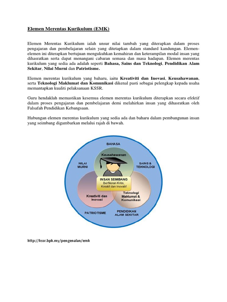 Lebih fokus bagi pembangunan modal insan yang slideshow 5087469. Elemen merentas kurikulum (emk) ialah unsur nilai tambah yang diterapkan dalam proses pdpc selain yang ditetapkan dalam standard kandungan. Kreativiti dan inovatif keusahawanan teknologi maklumat dan komunikasi (tmk) emk ini bertujuan untuk memberi lebih fokus bagi pembangunan modal insan yang berfikiran kreatif, kritis dan inovatif. Elemen merentas kurikulum dalam kbsr iaitu bahasa, sains dan teknologi, kelestarian alam sekitar. Download buku panduan elemen kreativiti merentas kurikulum.pdf (544.15 kb) from 214 kb ) elemen merentas kurikulum (emk) dalam kssr.rar ( 17.12 mb ) buku panduan usb modem iclick cdma windows 7.pdf ( 249 kb ) buku.